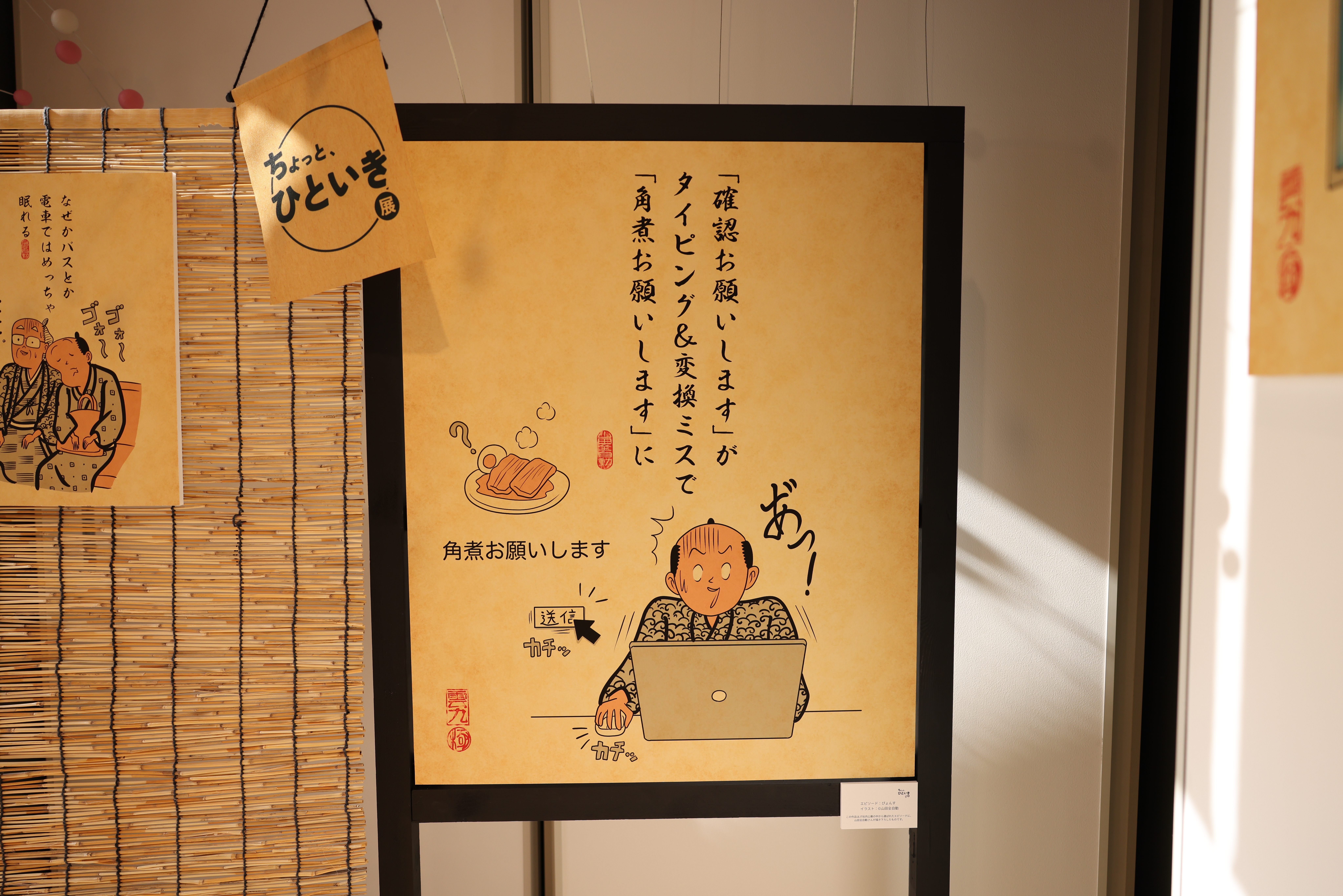 SNSで人気を集めるイラストレーター、山田全自動さんによる特別展示『ちょっと、ひといき展~みんな頑張ってるでござる~』をご紹介。