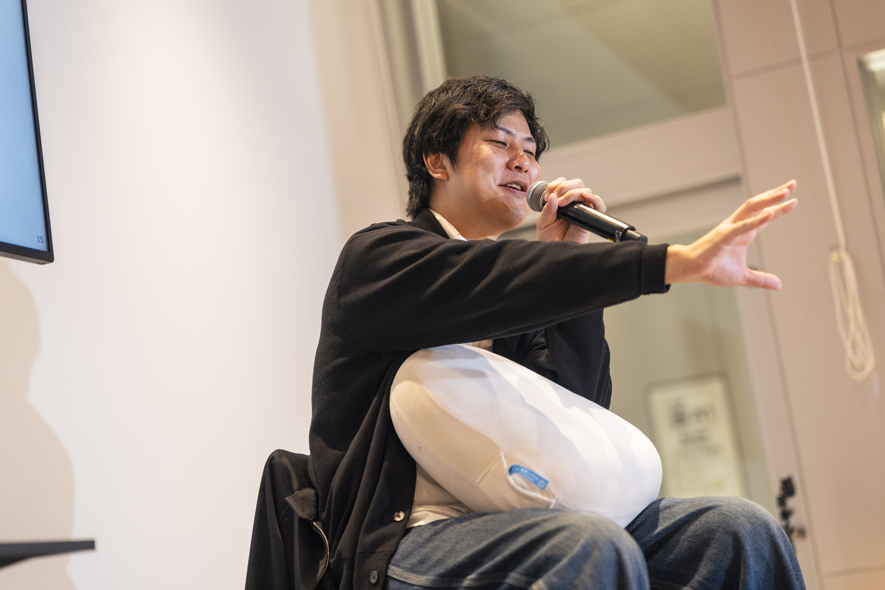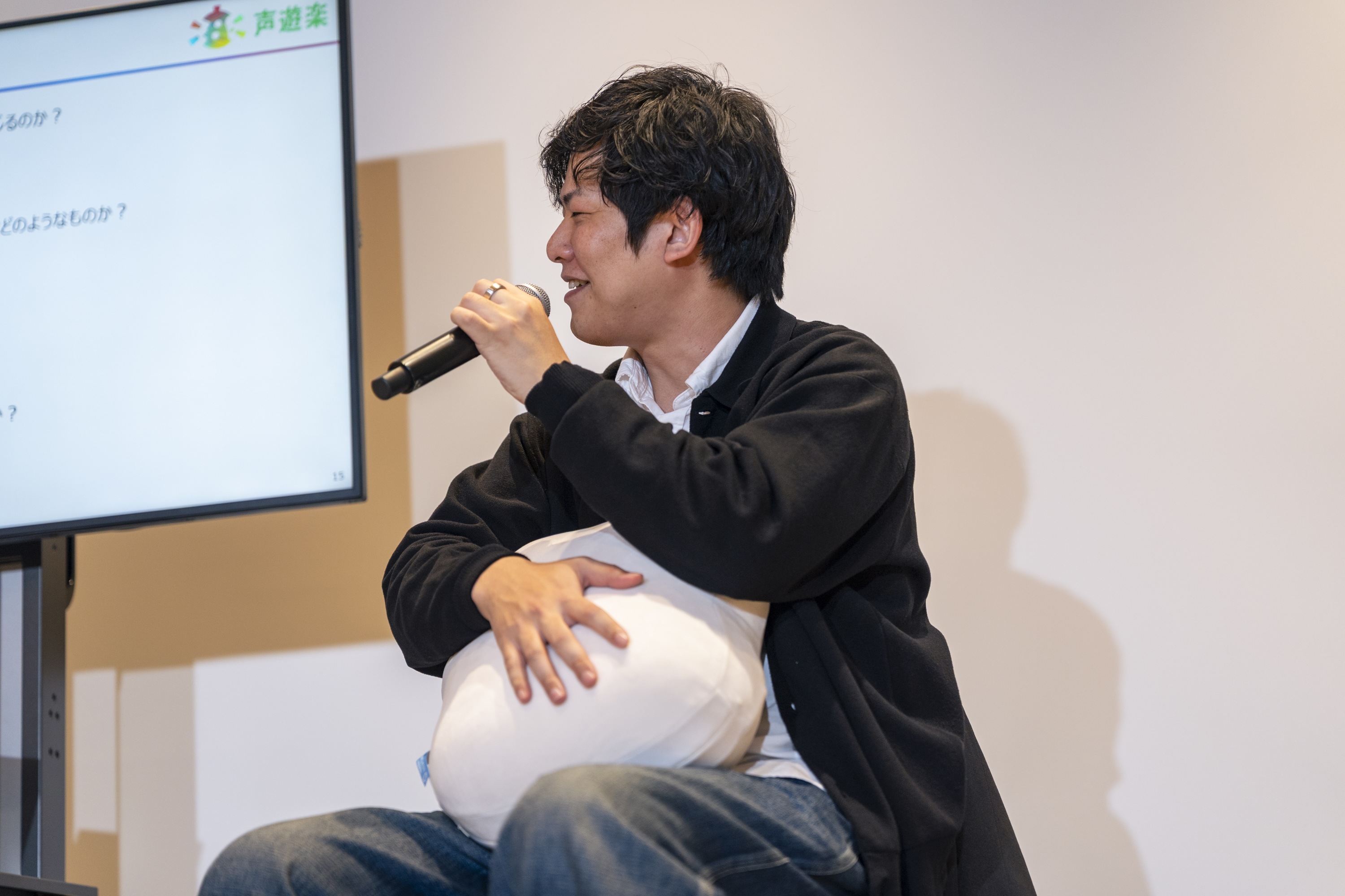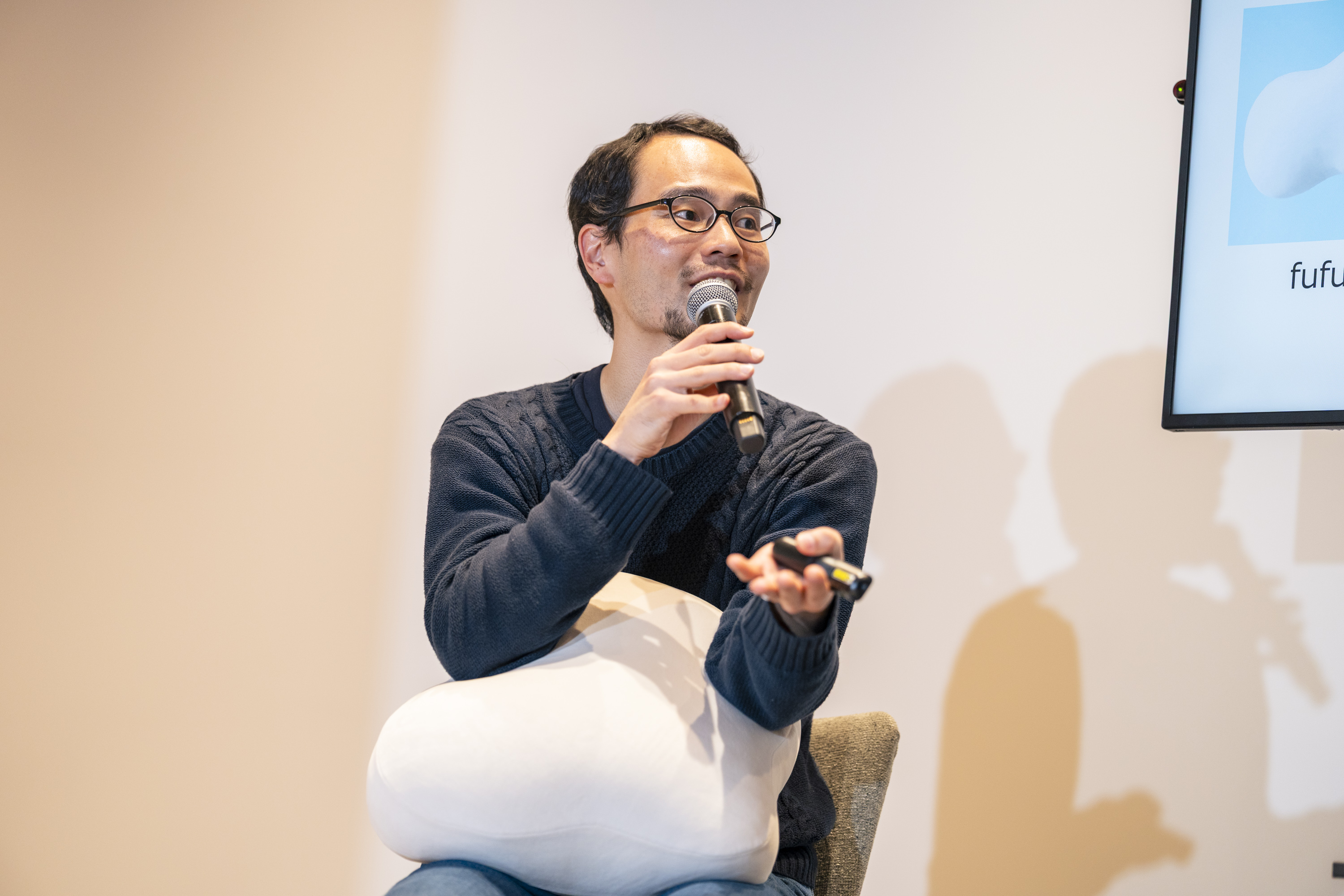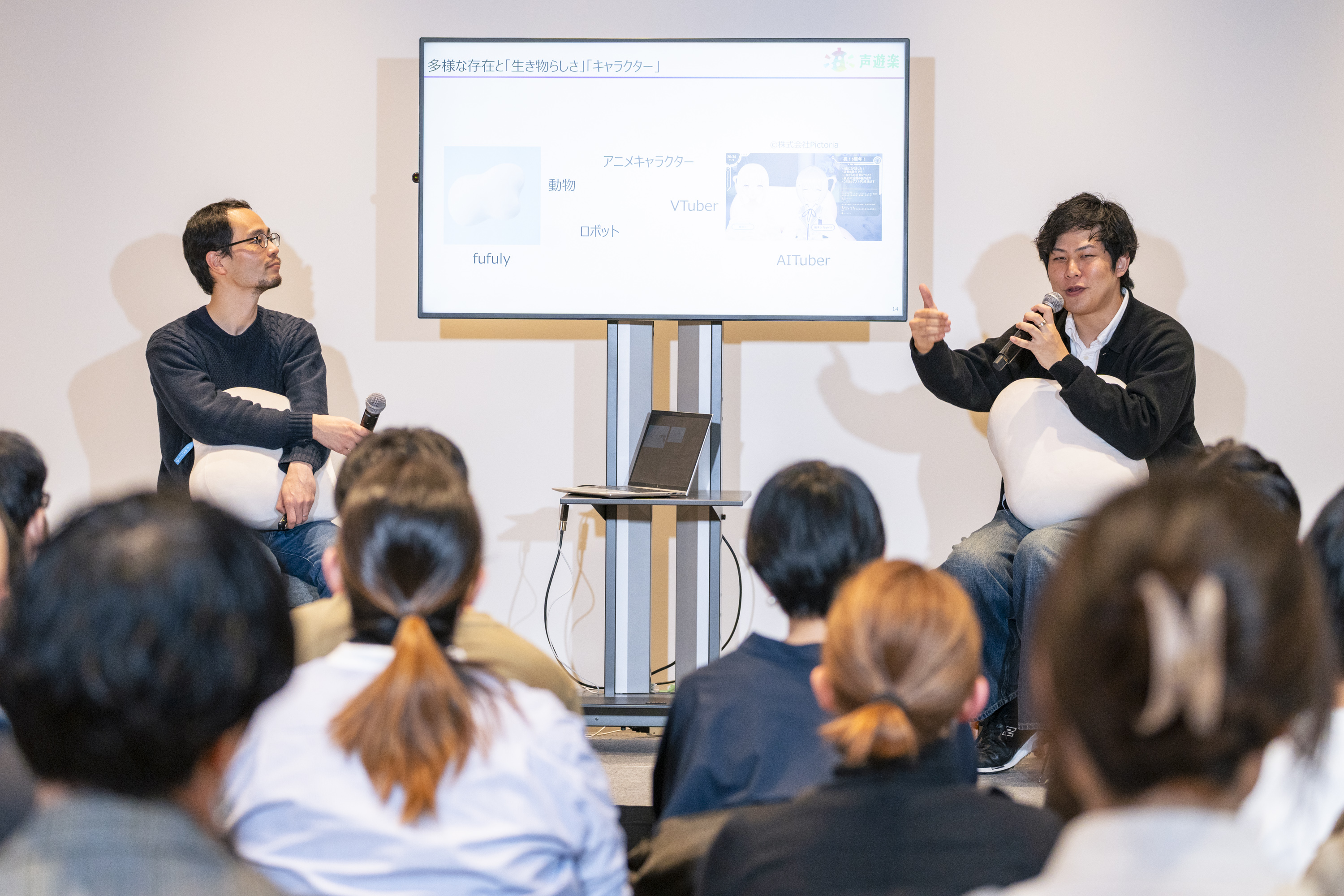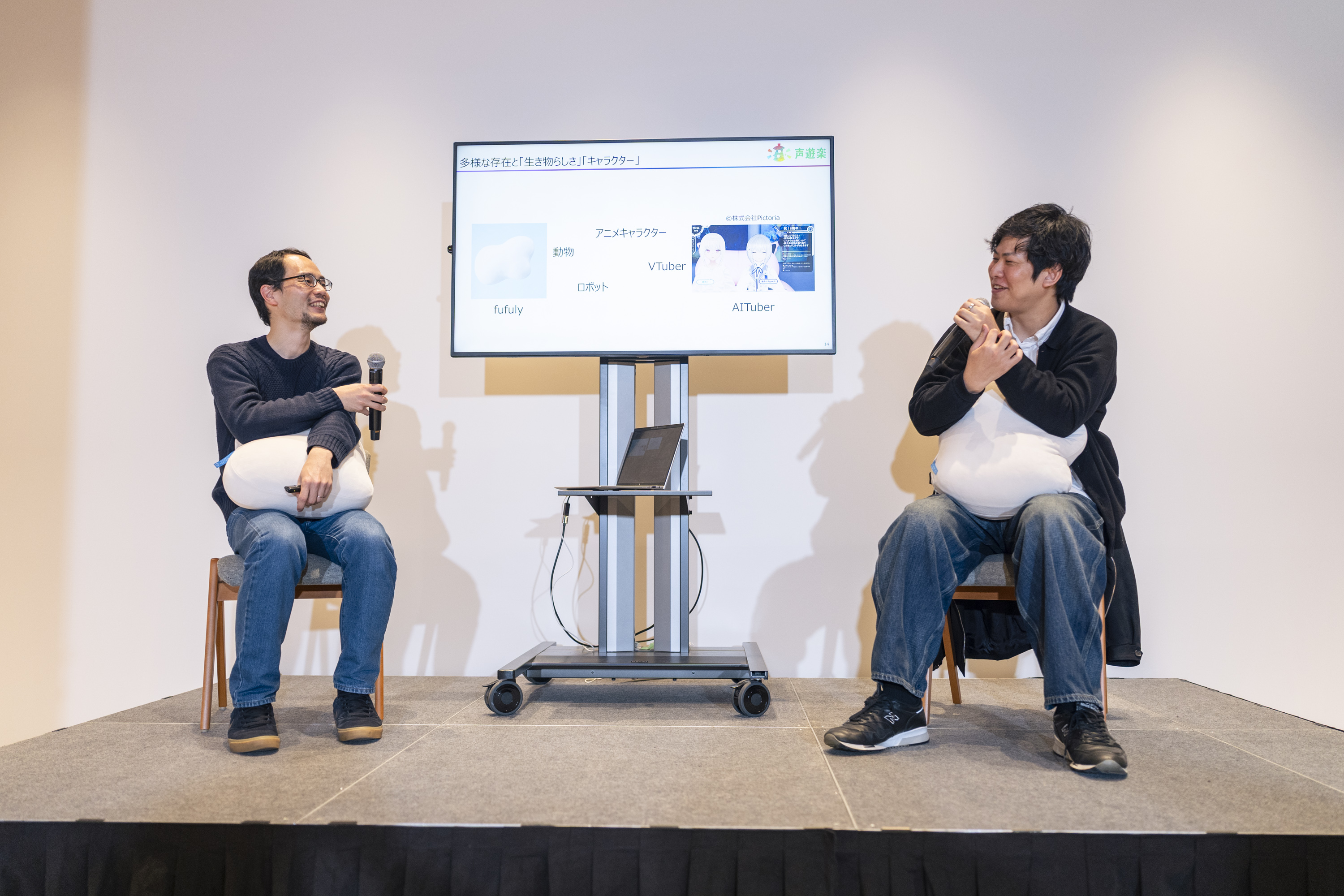 林さん「皆さんfufulyを抱えると、『これ』ではなく『この子』と言うんです。こんなふうに、会話のできないクッションから、実際に会話ができるAI VTuber(AITuber)まで、私たちは様々なものに生き物らしさを感じています。今日はそんな生き物らしさについて、いろいろお話しできればと思います。明渡さん、fufulyを触ってみていかがですか?『この子』って呼びたくなりますか?」